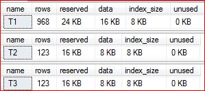 In the TEST database, I have 3 tables namely T1 (968 rows), T2 (123 rows) and T3 (123 rows).